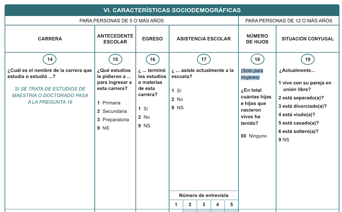 “Tras horas de revisar cuestionarios de las encuestas para hogares que ha levantado el INEGI en los últimos tres años corroboré que solo a las mujeres se les pregunta si tienen hijos”, revela la investigadora Fátima Masse. “¿Por qué? ¿Acaso la paternidad no es una característica sociodemográfica relevante?”