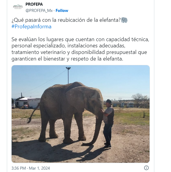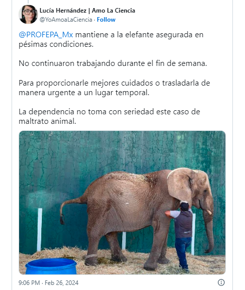 Sin embargo, tras asegurarla el 21 de febrero, activistas como la propia Lucía Hernández denuncian que la Profepa no actuó como debería. Hasta este 3 de marzo la elefanta se mantiene en el mismo predio de Lagos de Moreno donde fue encontrada. Profepa informó que hay personal procurando que tenga alimentación adecuada, pero las condiciones en que vive son las mismas.