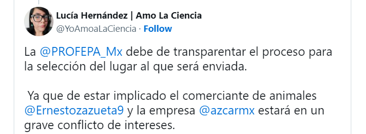 Ahora bien, Lucía Hernández acusa que no hay transparencia en la selección del destino de la elefanta. Señala que elegir a ese lugar como destino de Annie podría responder a un conflicto de intereses por la participación del empresario Ernesto Azueta, a quien califica como “comerciante de animales”.