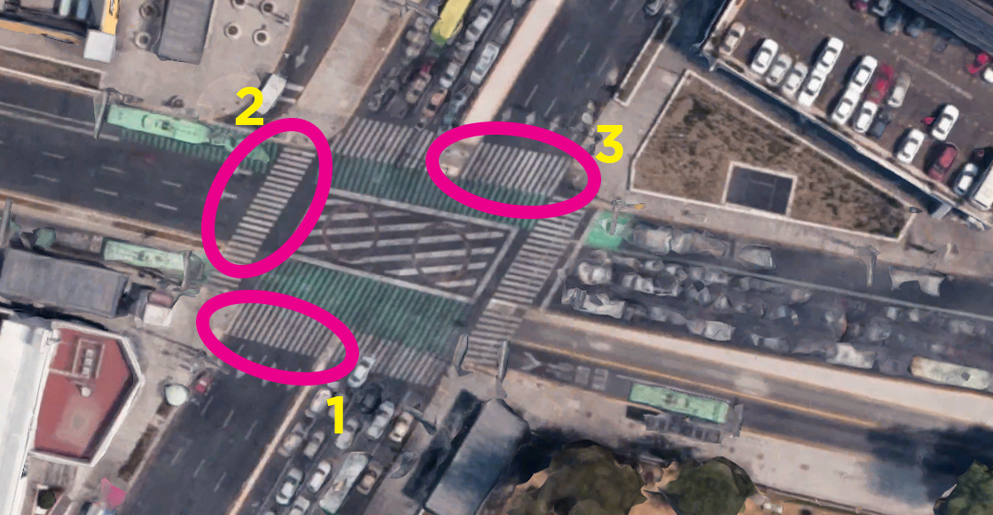 El tercer punto rojo [3] es quienes tienen que andar a las vivas por las vueltas sobre Universidad, mientras esquivan un paso peatonal lleno de postes.