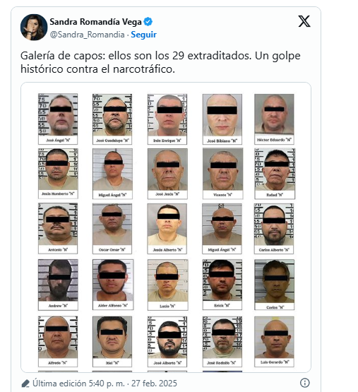 Claramente las especulaciones en torno a la extradición de los 29 narcos no se hicieron esperar. Todo ocurre en medio de la presión que ejerce Donald Trump de imponer aranceles si el Gobierno de México no detiene el tráfico de drogas hacia Estados Unidos, principalmente el fentanilo.