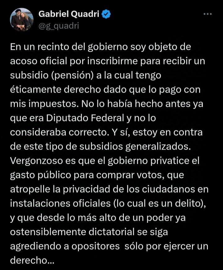 “Soy objeto de acoso oficial por inscribirme para recibir un subsidio (pensión) a la cual tengo éticamente derecho dado que lo pago con mis impuestos. No lo había hecho antes ya que era Diputado Federal y no lo consideraba correcto. Y sí, estoy en contra de este tipo de subsidios generalizados. Vergonzoso es que el gobierno privatice el gasto público para comprar votos”, señaló en su cuenta de X.