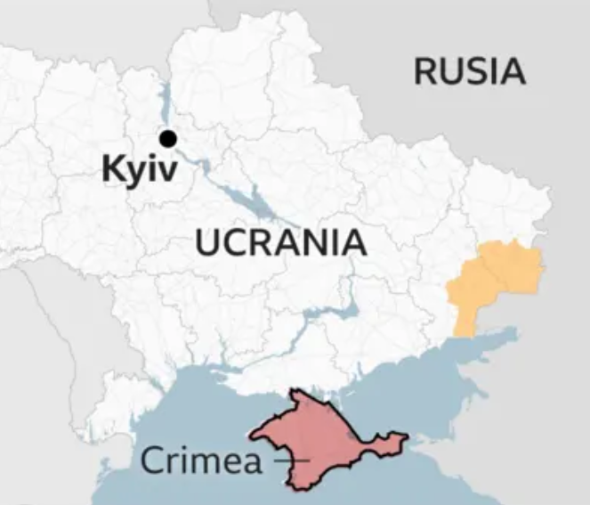 Pero primero, para entender qué tanto ha avanzado Rusia, necesitamos tener un mapa que nos permita ver la comparación. Antes de febrero de 2022, así se veía el territorio de Ucrania (Crimea ya era controlada por Rusia y la parte en color son Donetsk y Lugansk, tomadas por separatistas antes de la guerra):