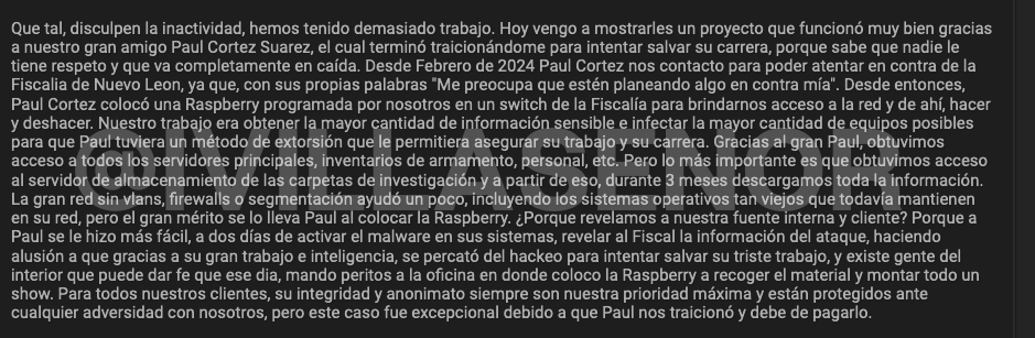 “Hoy vengo a mostrarles un proyecto que salió muy bien gracias a nuestro buen amigo Paul Cortez Suárez (…) Nos contactó para poder atentar contra la Fiscalía de Nuevo León ya que, con sus propias palabras, ‘Me preocupa que estén planeando algo en contra mía’. Desde entonces, colocó una Raspberry programada por nosotros en un switch de la Fiscalía para brindarnos acceso a la red y, de ahí, hacer y deshacer“.