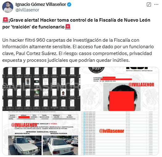 La información viene del periodista Ignacio Gómez Villaseñor (@ivillasenor en X). Reporta que un hacker, conocido como Scorpion, filtró un archivo de 14.7 GB con 960 carpetas de investigación de la Fiscalía de Nuevo León.