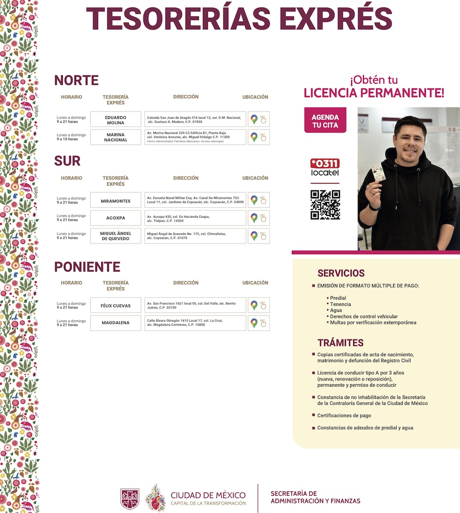 Ok, también en un horario de 9 de la mañana a 9 de la noche pero todos los días —de lunes a domingo—, las tesorerías exprés abrirán sus puertas para que puedas tramitar la licencia de conducir permanente de CDMX. Aquí la lista: