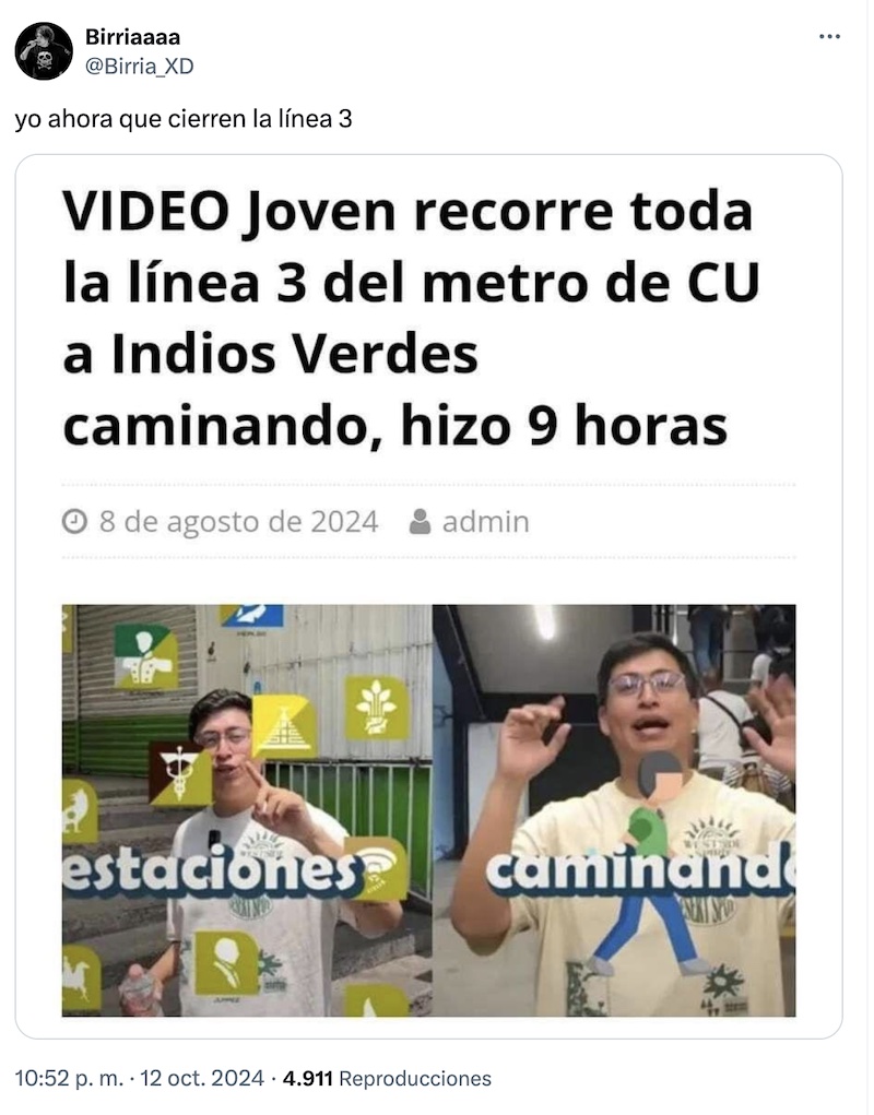 Los memes ya salieron pese a que todo lo que sabemos es la confirmación de la jefa de Gobierno de CDMX Clara Brugada acerca de que cerrarán la Línea 3 después de que abran por completo la Línea 1 del Metro que lleva poco más de dos años cerrada de manera parcial.