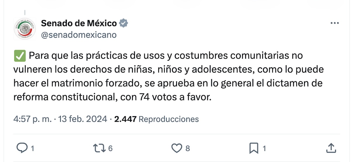 ¿Por qué? El martes 13 de este 2024, el Senado aprobó cambiar el artículo 2 de la Constitución para prohibir el matrimonio infantil en las comunidades indígenas.