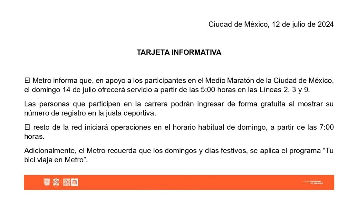 El resto de la red del Metro operará como todos los domingos, a partir de las 7 am. En el caso del Metrobús, habrá un cambio en el servicio de las Líneas 1, 3, 4 y 7 por este evento deportivo, así que tomen sus precauciones: