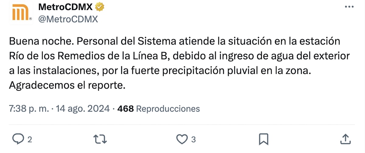 Ante los reportes, el Metro de CDMX respondió que ya atendía la situación en la estación de Río de los Remedios y de las otras estaciones por el “ingreso de agua del exterior a las instalaciones” por las fuertes lluvias en la zona.