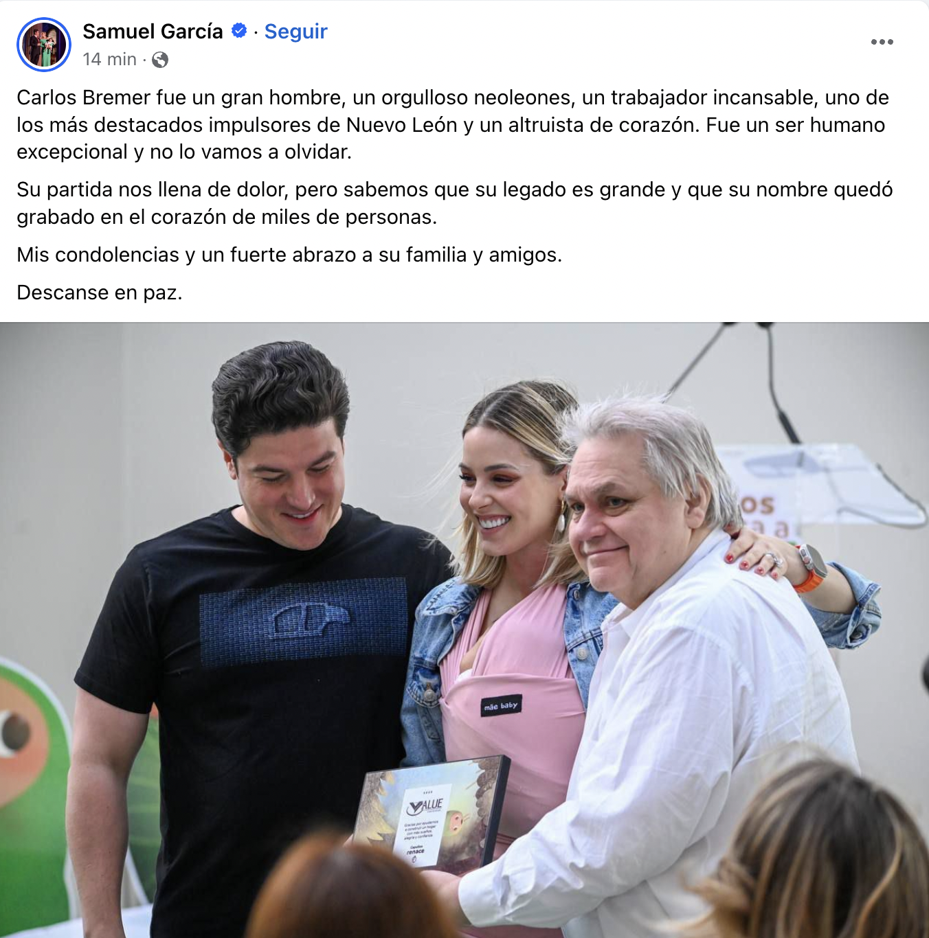 El gobernador de Nuevo León, Samuel García, destacó que el empresario fue uno de los principales impulsores del estado y que era altruista de corazón.