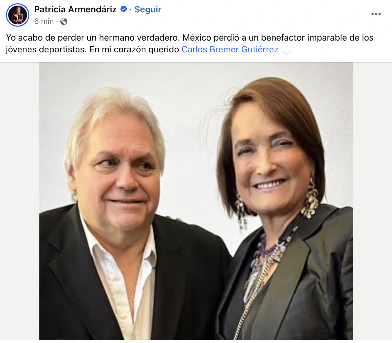 Por medio de sus redes sociales, una de las empresarias que lo acompañó en Shark Thank México, Patricia Armendariz, lamentó la muerte de su amigo Carlos Bremer.