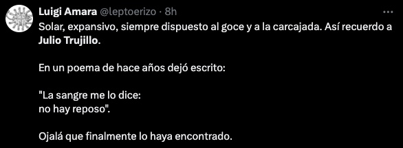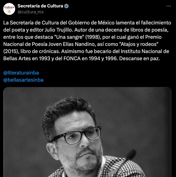 La muerte de Julio Trujillo fue confirmada por el Instituto Nacional de Bellas Artes y Literatura (INBAL) y, a partir de ahí, colegas y amigos del poeta y editor comenzaron a expresar sus condolencias.