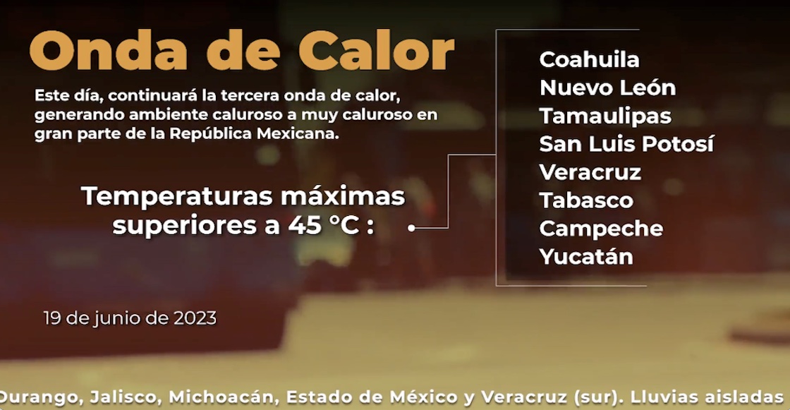 El 19 de junio se espera que estados como Campeche, Coahuila, Nuevo León, San Luis Potosí, Tabasco, Tamaulipas, Veracruz y Yucatán registren temperaturas mayores a los 45 °C.