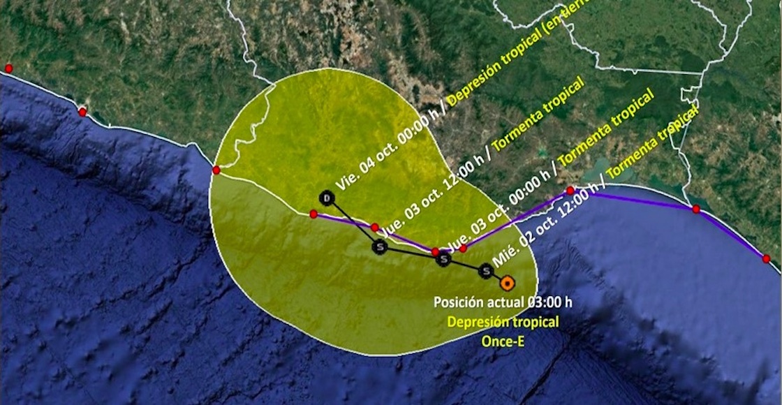 La depresión tropical Once-E presenta vientos de 55 kilómetros por hora y rachas de 75. Según el pronóstico de la CONAGUA, se desplaza hacia el oeste-noreste a una velocidad de 9 KM/h.