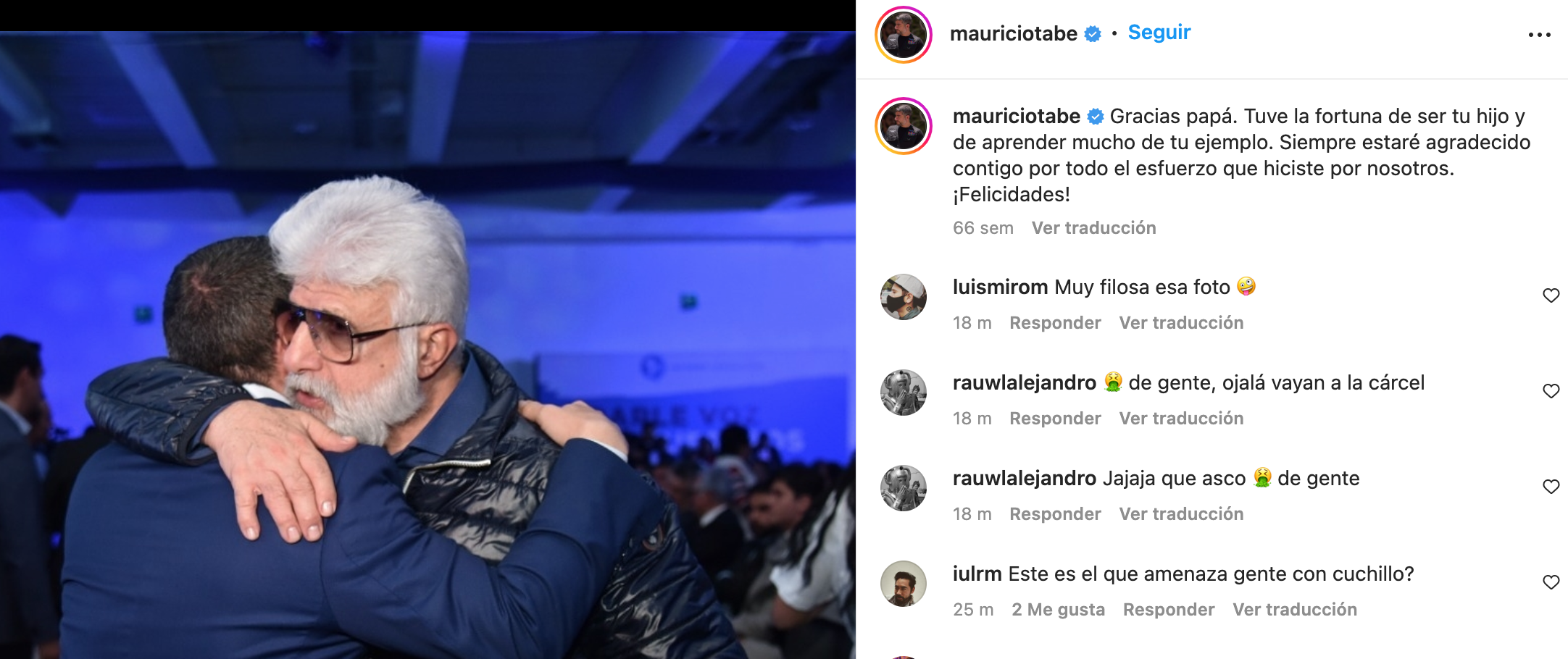 Buscamos en el Instagram del alcalde y encontramos en esta foto, en la que agradece a su papá. Parece que el sujeto con el cuchillo sí es su padre, Daniel Tabe Tabe.