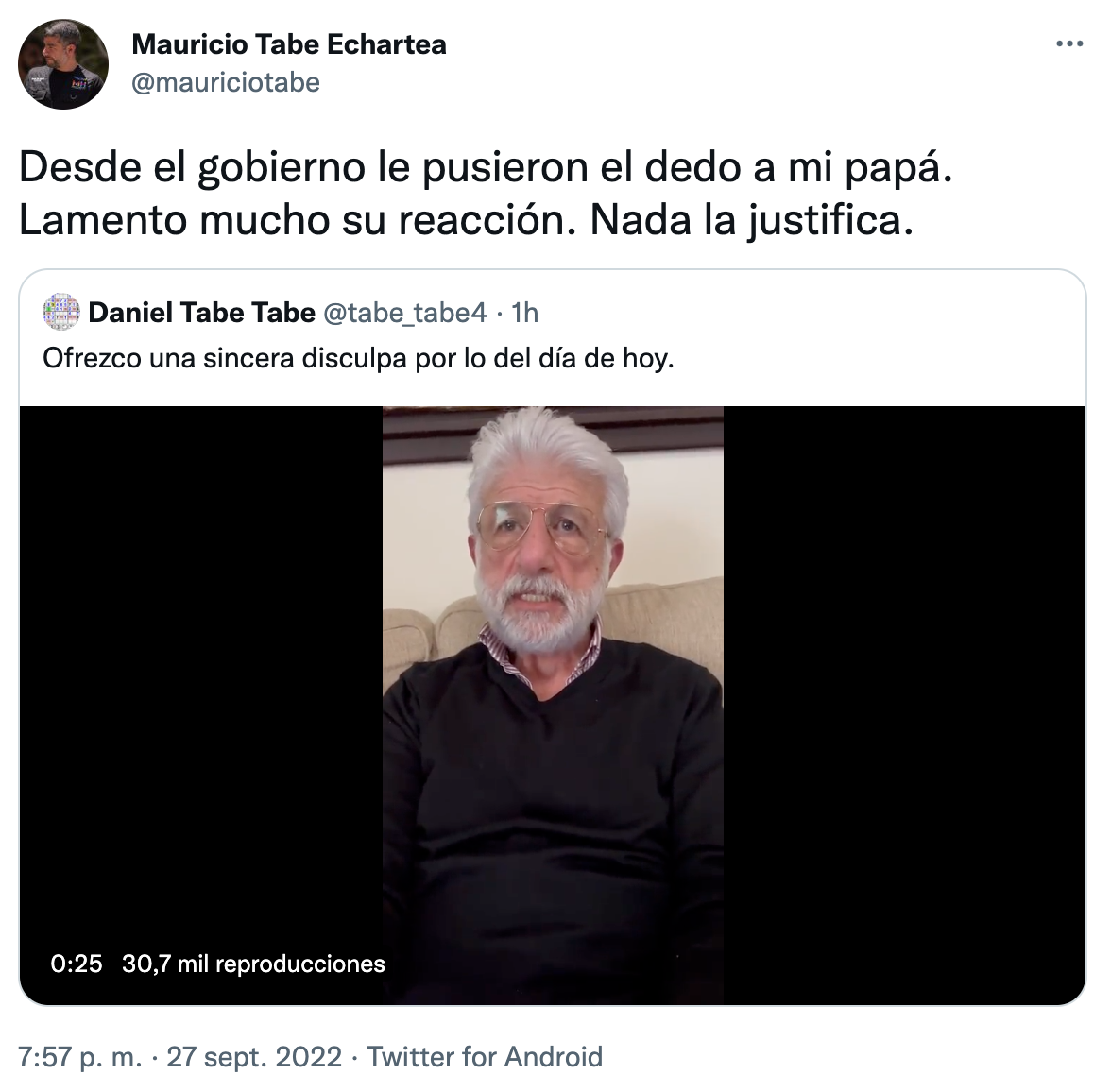 Por su parte, el alcalde retuiteó el video y agregó: “Desde el gobierno le pusieron el dedo a mi papá. Lamento mucho su reacción. Nada la justifica“.