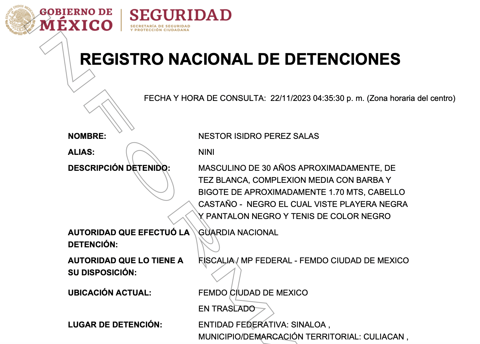 El Registro Nacional de Detenciones asegura que los elementos de la Guardia Nacional detuvieron a Néstor Isidro Pérez Salas mientras vestía ropa negra y se encontraba en la colonia Colinas de la Rivera.