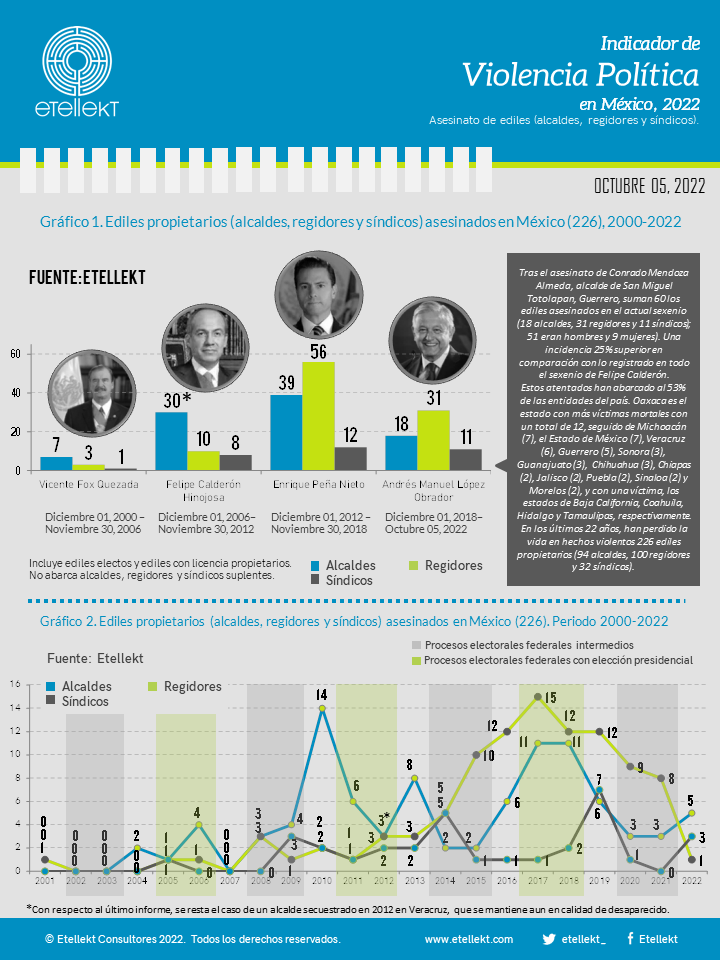 La Consultoría Etellekt explicó que con el asesinato de este alcalde ya son 60 alcaldes asesinatos en lo que va del sexenio (18 alcaldes, 31 regidores y 11 síndicos).