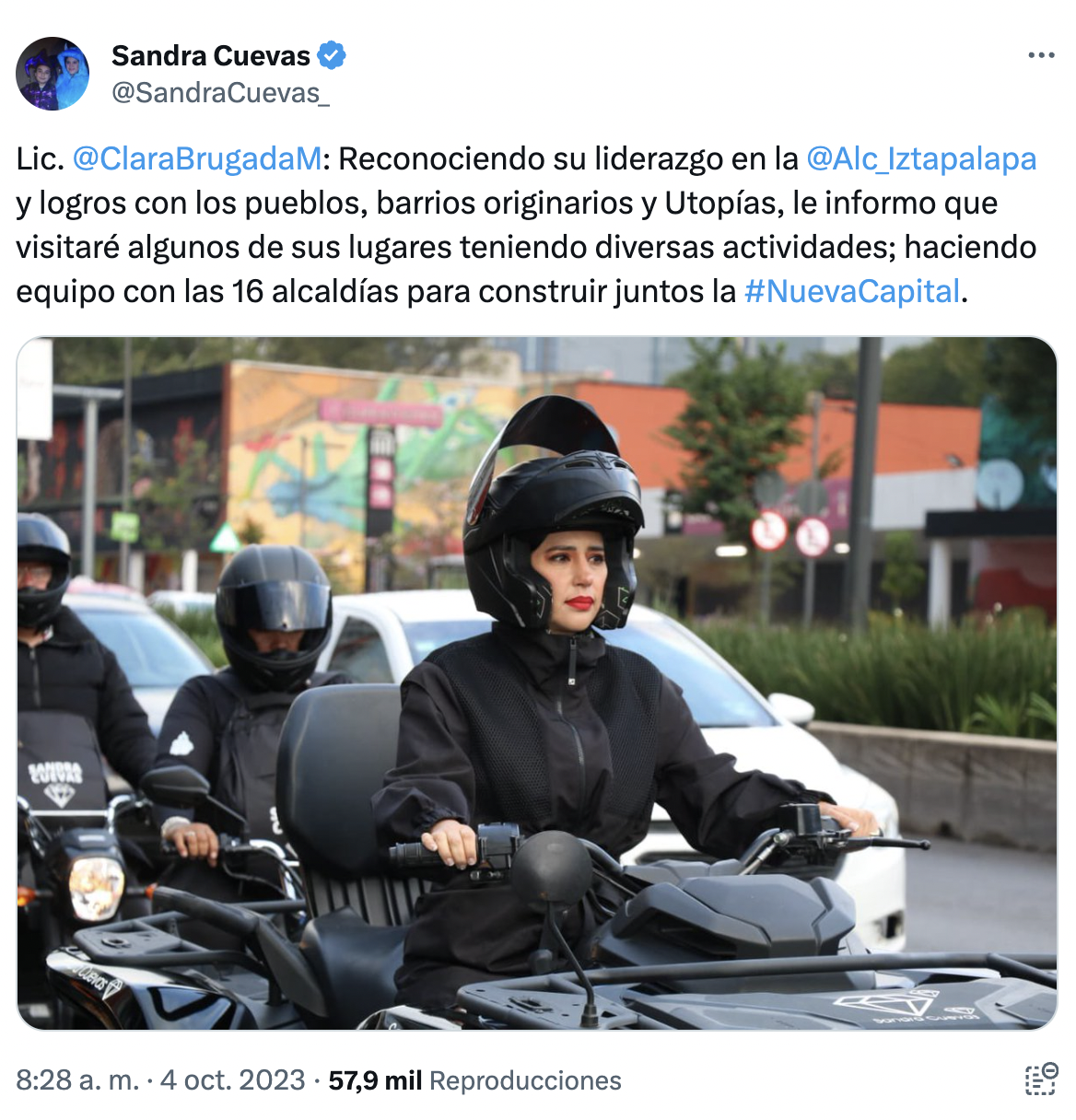 Ya con el permiso, este 4 de octubre ella y su equipo salieron a las calles para realizar el primer recorrido. Aproximadamente a las 8:30 de la mañana, Sandra Cuevas publicó un tuit en sus redes sociales para avisarle a Clara Brugada, alcaldesa con licencia de Iztapalapa, que iba a estar haciendo actividades por allá.