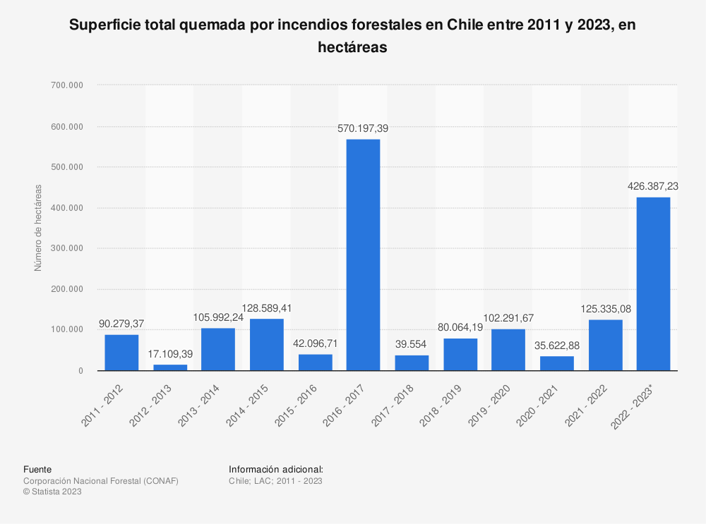 Regresando un poco, en febrero se registraron varios incendios forestales en Chile, sobre todo en las regiones de O’Higgins y Los Lagos. Las mayores afectaciones se centraron en Maule y La Araucanía, al centro y sur del país.