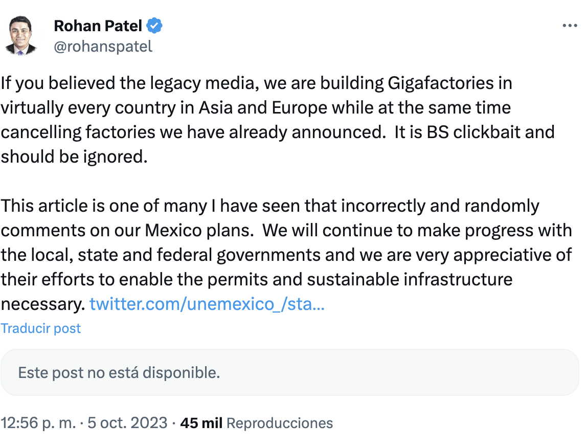 Por medio de sus redes sociales, Rohan Patel, directivo de Tesla, afirmó que los artículos al respecto comentan de manera “incorrecta y aleatoria” sobre los planes de la empresa en México.