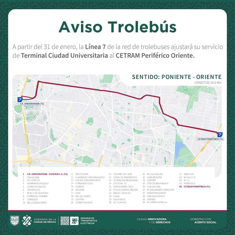 Sin embargo, como las obras ya terminaron y la Línea 12 ya está lista, el gobierno de CDMX decidió mantener a la Línea 7 del Trolebús —ya como un servicio permanente— y ampliando su ruta.