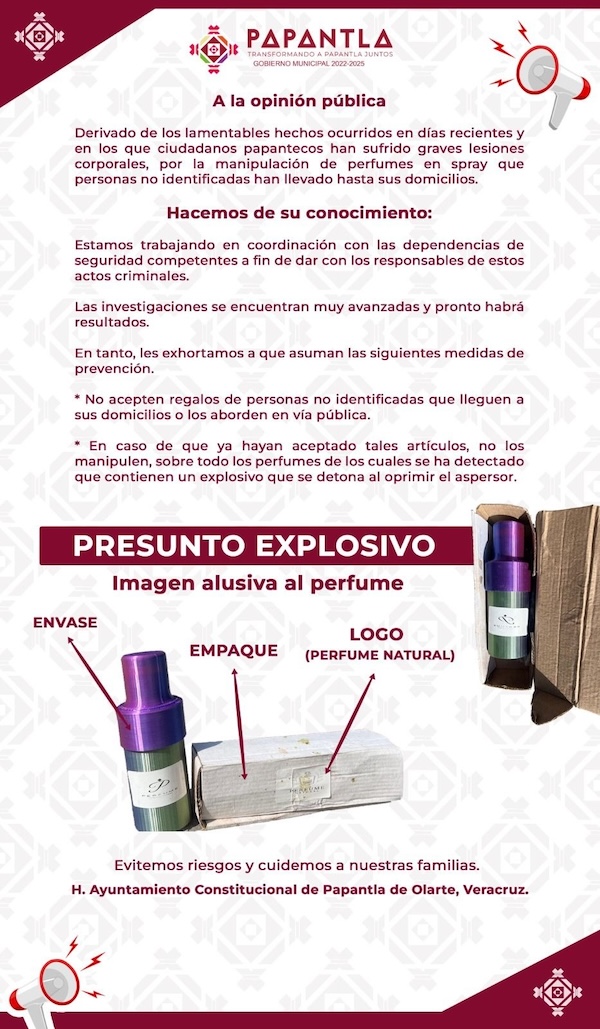 El Ayuntamiento de Papantla ha explicado que las lesiones fueron resultado de la manipulación de los perfumes en spray.