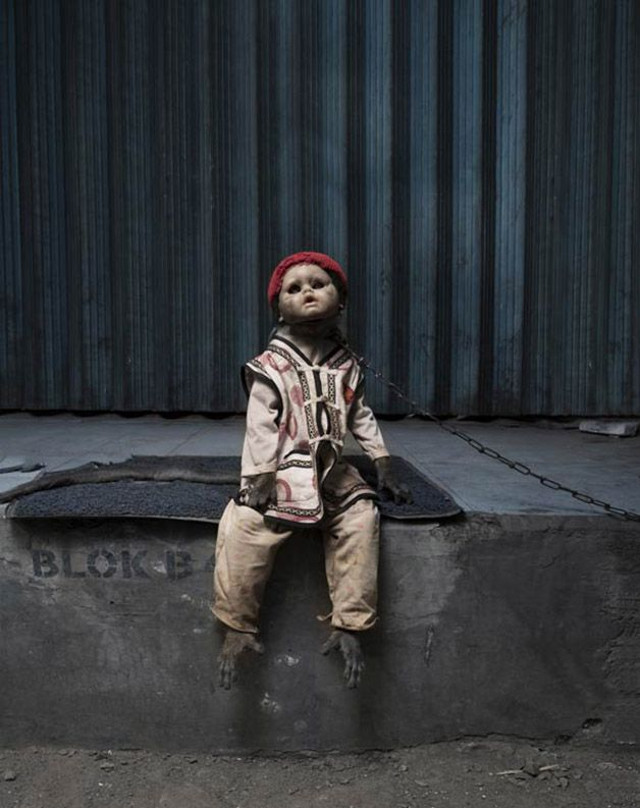 En algunos lugares de Asia, particularmente en Indonesia, existe la extraña costumbre de entrenar monos para mendigar dinero mientras usan máscaras formadas con cabezas de muñecas…
