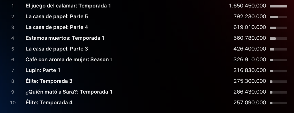 Cuando se lanzó el top 10 en la plataforma de Netflix, la medición se hacía en función del número de suscriptores que habían disfrutado dos minutos o más de la serie y película.