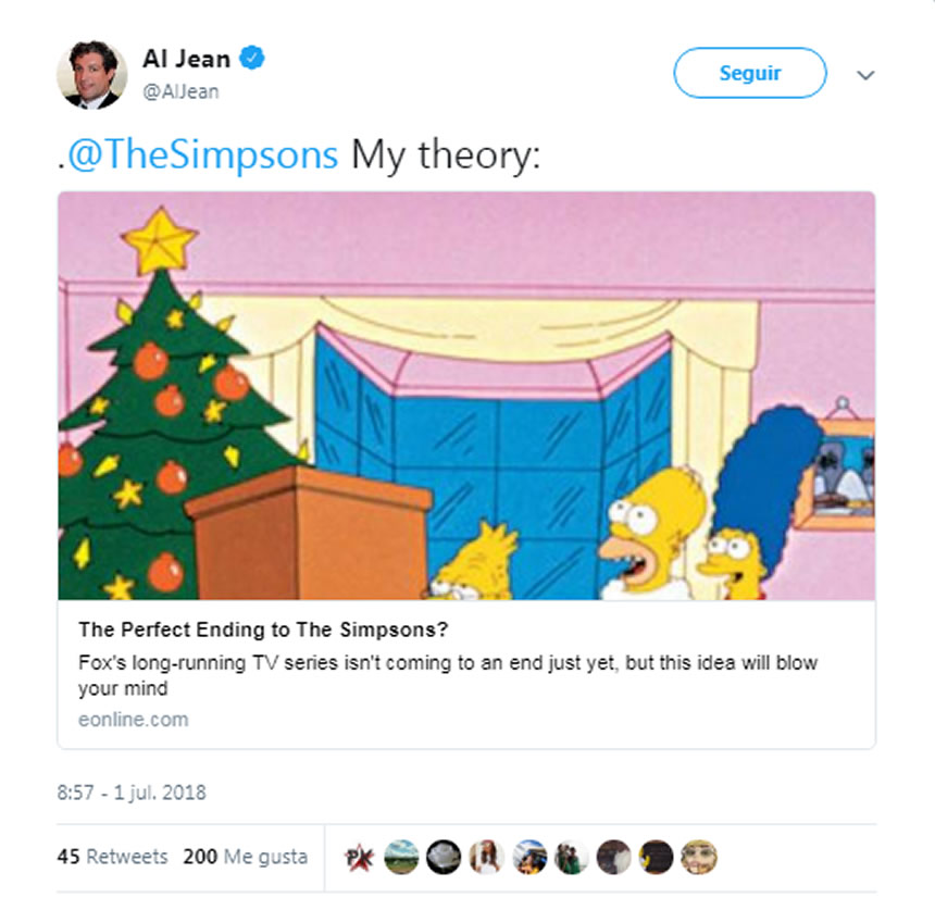 Pero mientras la serie se prepara para transmitir su temporada 30, Jean volvió a confirmar su hipótesis. Hace unos días al compartir una nota en su cuenta de Twitter titulada “El final de Los Simpson propuesto por el productor ejecutivo Al Jean es perfecto”.