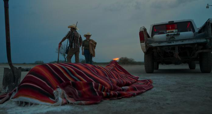 En El norte sobre el vacío existe una atmósfera de constante peligro que parece culminar en cada instante. En la historia, esto ocurre cuando dos sicarios llegan al rancho para exigir una cuota a Reynaldo a cambio de protección.