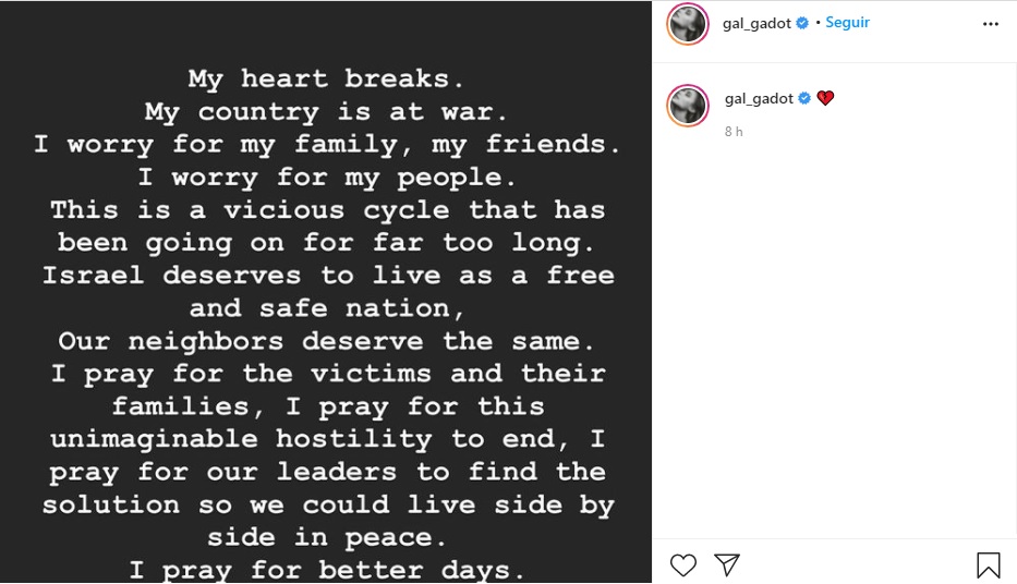 A través de sus redes sociales, la actriz expresó su preocupación por la situación aludiendo a que tanto su país de origen como el estado palestino merecen vivir en paz. Al final, la interprete de la Mujer Maravilla comentó que espera que el conflicto se apacigüe en los próximos días: