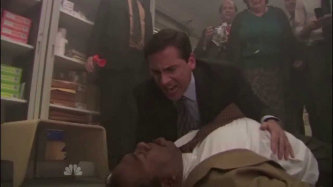 Es en el capítulo de dos partes titulado “Stress Relief” (episodios 14 y 15 de la quinta temporada) donde Michael Scott y compañía reciben una capacitación en primeros auxilios y luego de que Stanley sufriera un infarto durante el simulacro de incendio que planea Dwight, quien critica que sus compañeros no le hicieron caso cuando dio su curso.