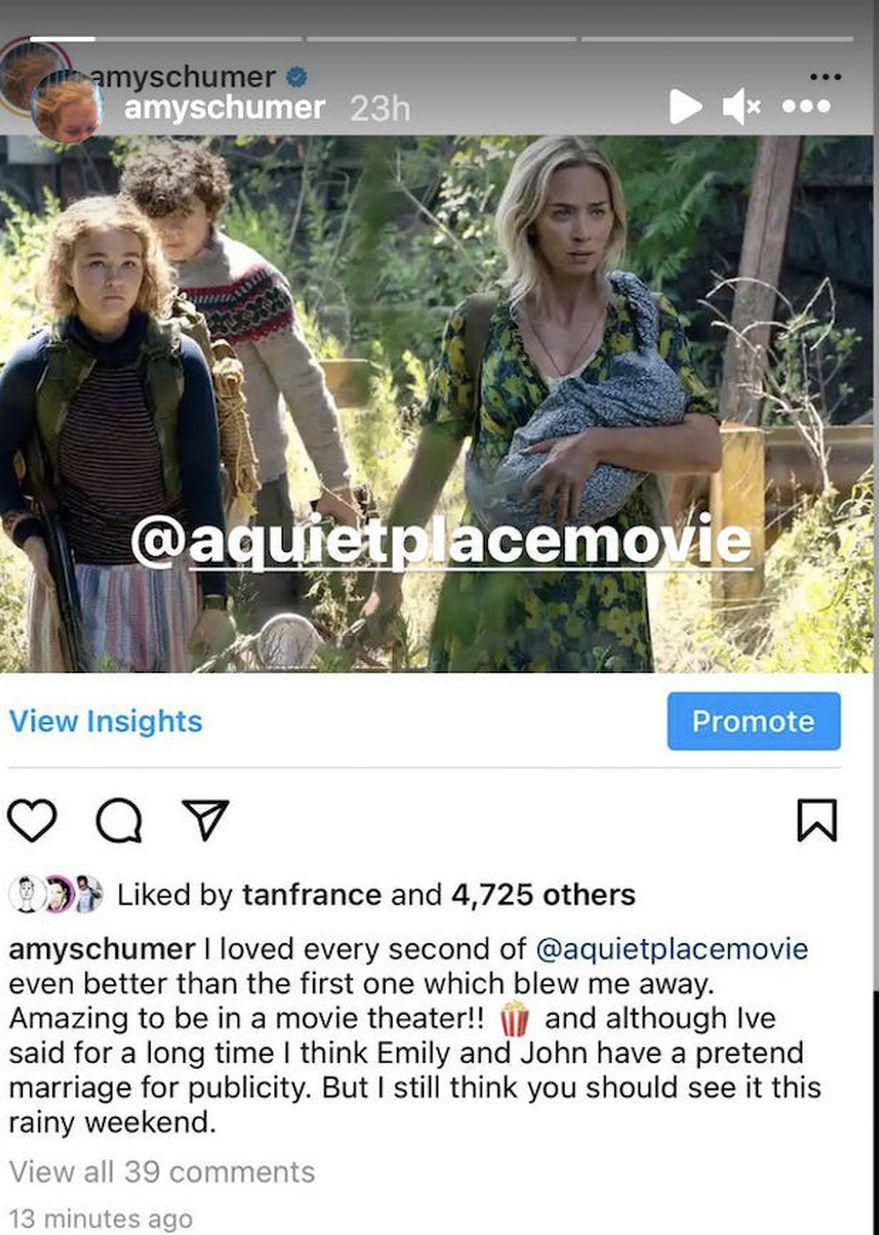 Y la verdad es que la película ha sido bien recibida tanto por el público como por la crítica especializada. Sin embargo, el comentario más ‘ácido’ vino de la comediante Amy Schumer, quien hace poco elogió la cinta y de paso, bromeó diciendo que el matrimonio de John y Emily era pura publicidad para la película. La respuesta, por supuesto, no se hizo esperar.