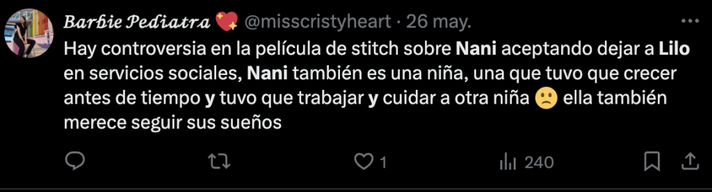 Otros también opinan que con este final, la película de ‘Lilo & Stitch’ da el mensaje de que los niños son un estorbo en la vida y si uno quiere cumplir sus metas debe ser sin ellos en el camino. Algo que a muchos no les ha gustado nadita.