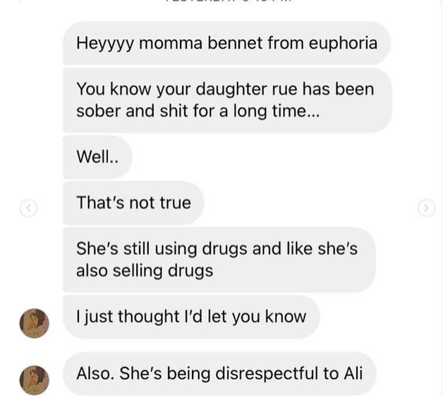 “Hola mamá Bennett de Euphoria, usted sabe que su hija Rue ha estado sobria por mucho tiempo. Bueno, eso no es cierto, ella aún consume drogas y también las está vendiendo. Sólo se lo quería hacer saber”, dice uno de los mensajes que King ha recibido en estos días.
