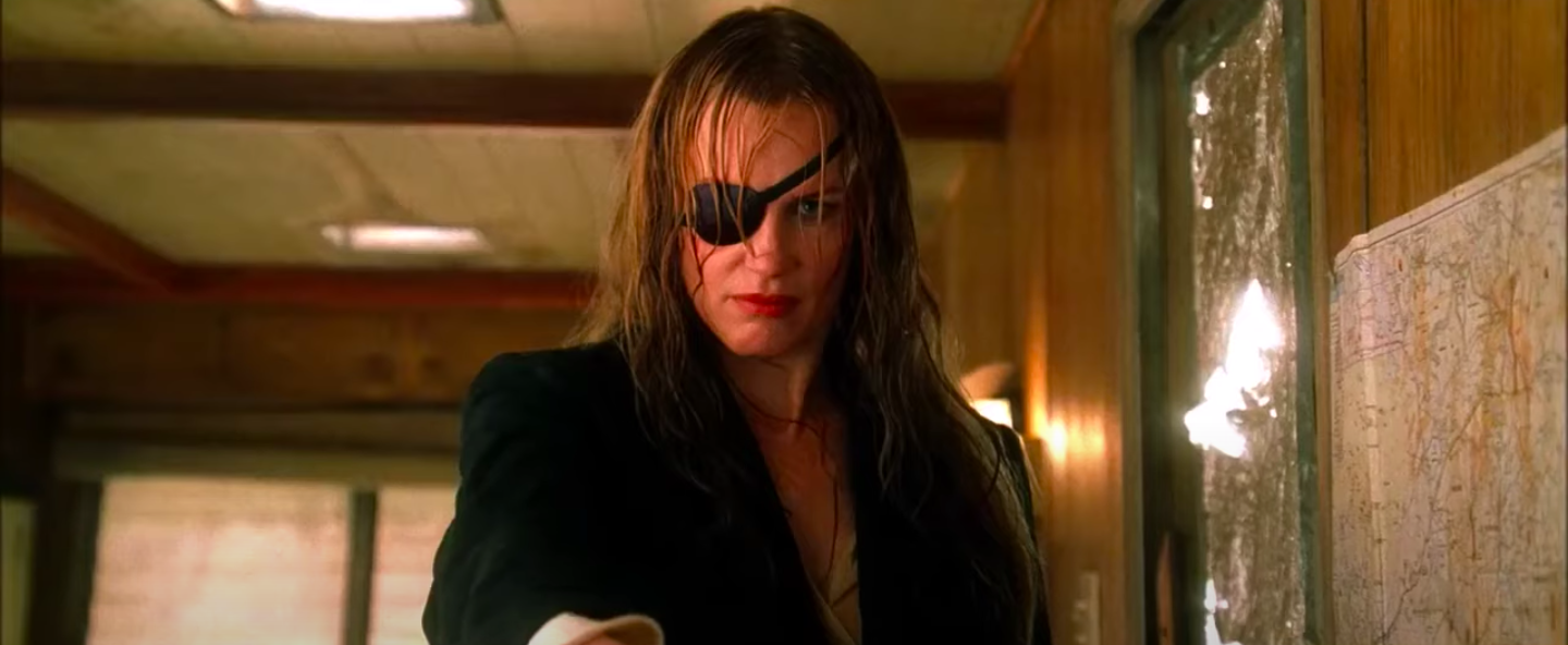 Beatrix se enoja mucho, y mientras sostiene su espada –Elle sostiene la espada que Bill le regaló a Budd de Hanzō– comienzan a decirse que alguna va a morir. “Bitch, you don’t have a future“, dice Kiddo. Corren, se quedan pegadas con sus respectivas espadas, de frente, y Beatrix Kiddo le saca un ojo (el único que le quedaba).