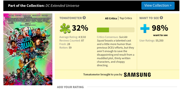 Al igual que con Batman v Superman, la mayoría de estas críticas no son nada favorables, en especial las que el sitio Rotten Tomatoes ha tomado para calificar a Suicide Squad, la cual tiene un 32% de aprobación, tomando como base 68 reseñas, de las cuales solo 24 son positivas.