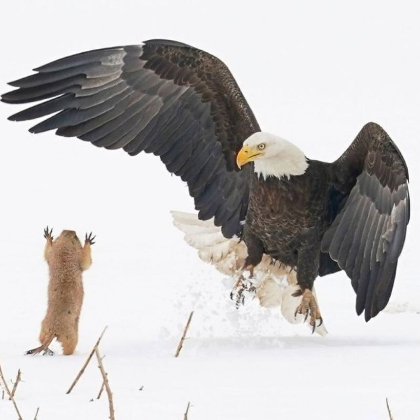 “Cuando el águila calva fracasó en su intento de cazarlo, este perrito de las praderas saltó hacia ella y la sorprendió lo suficiente como para poder escapar a una madriguera cercana, para luego darle un buen susto. ¡Una historia realmente similar a la de David contra Goliath!”, cuenta Artur Trevino, quien tomó la instantánea durante el invierno en Houston Texas. Entra a la página oficial de los ‘Comedy Wildlife Photo 2021′, para votar por tu foto consentida, pero, córrele, solo tienes 10 días para hacerlo.