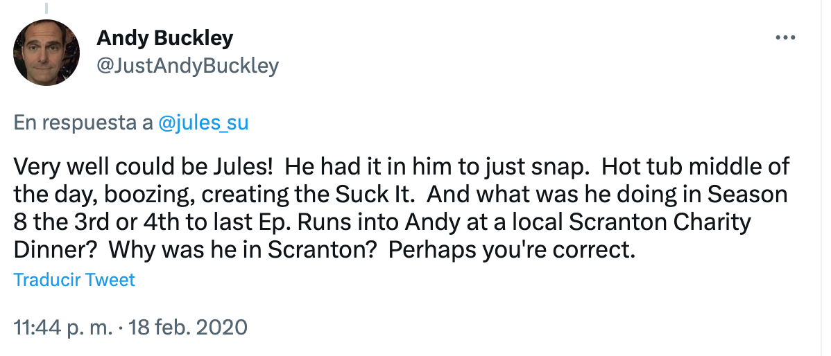 “¿Lo tenía todo para, simplemente, estallar. Bañera de hidromasaje a mitad del día, bebiendo, creando el Suck It. ¿Y qué estaba haciendo en la temporada 8 en el tercer o cuarto al último episodio? ¿Se encuentra con Andy en una cena benéfica local de Scranton? ¿Por qué estaba en Scranton? Quizás tengas razón”, dijo Andy Buckley al respecto, quien dio vida a David Wallace.