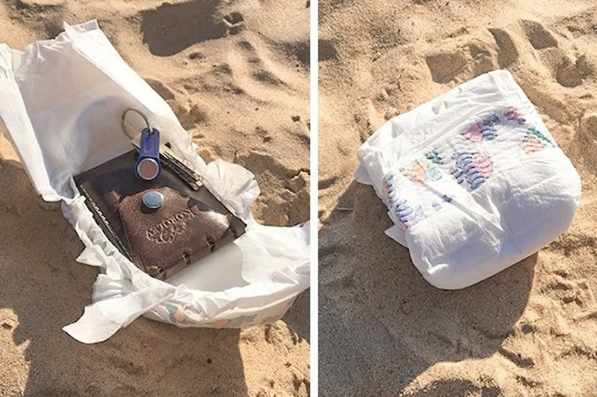 Pero si en realidad quieres evitar que roben tus cosas en la playa, un truco infalible es el del pañal. Piénsalo bien, quién rayo se querrá llevar un pañal con premio adentro. Lo mejor es que el truco del pañal es versátil; puedes esconder tus cosas con tan sólo abrirlo o bien, sellarlo como si estuviera sucio, tus pertenencias estarán sanas y salvas cuando vuelvas del mar.