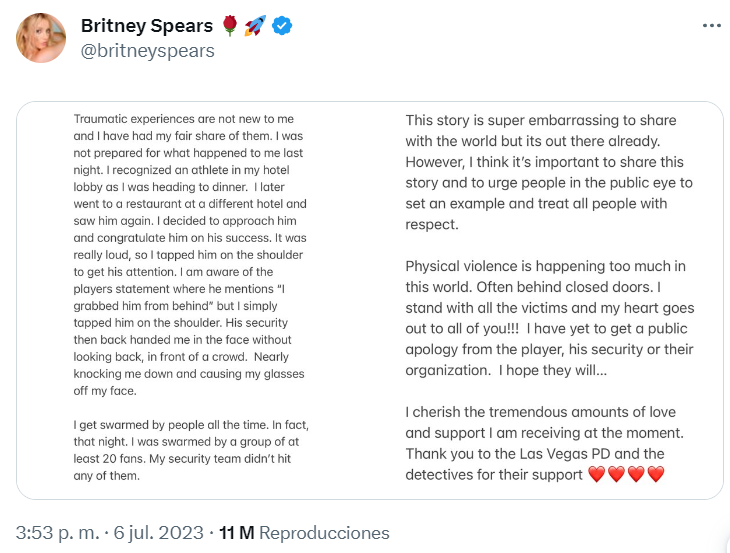 Britney menciona en su carta que la violencia debe acabar e invita a tratar a todo mundo con respeto. Y como decíamos, niega eso de que se disculparon, pues dice seguir en espera de una disculpa de parte de Victor Wembanyama, de su seguridad y de su equipo.