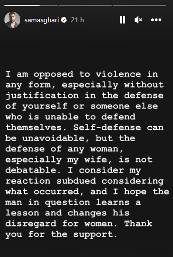 “Defender a cualquier mujer, especialmente a mi mujer, no es debatible. Considero que mi reacción responde a lo ocurrido, y espero que el hombre en cuestión aprenda una lección y vea su falta de respeto a las mujeres. Gracias por el apoyo”, comentó.