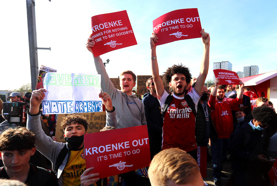 Un día después, previo al juego contra Everton, miles de seguidores se dieron cita a las afueras del Emirates Stadium para exigir la renuncia de Kroenke. Decenas mostraron pancartas con frases como “Fuera Kroenke”, “Del Arsenal hasta la muerte, fuera Kroenke”, “Es tiempo de irse” “Nosotros importamos, tú no”.