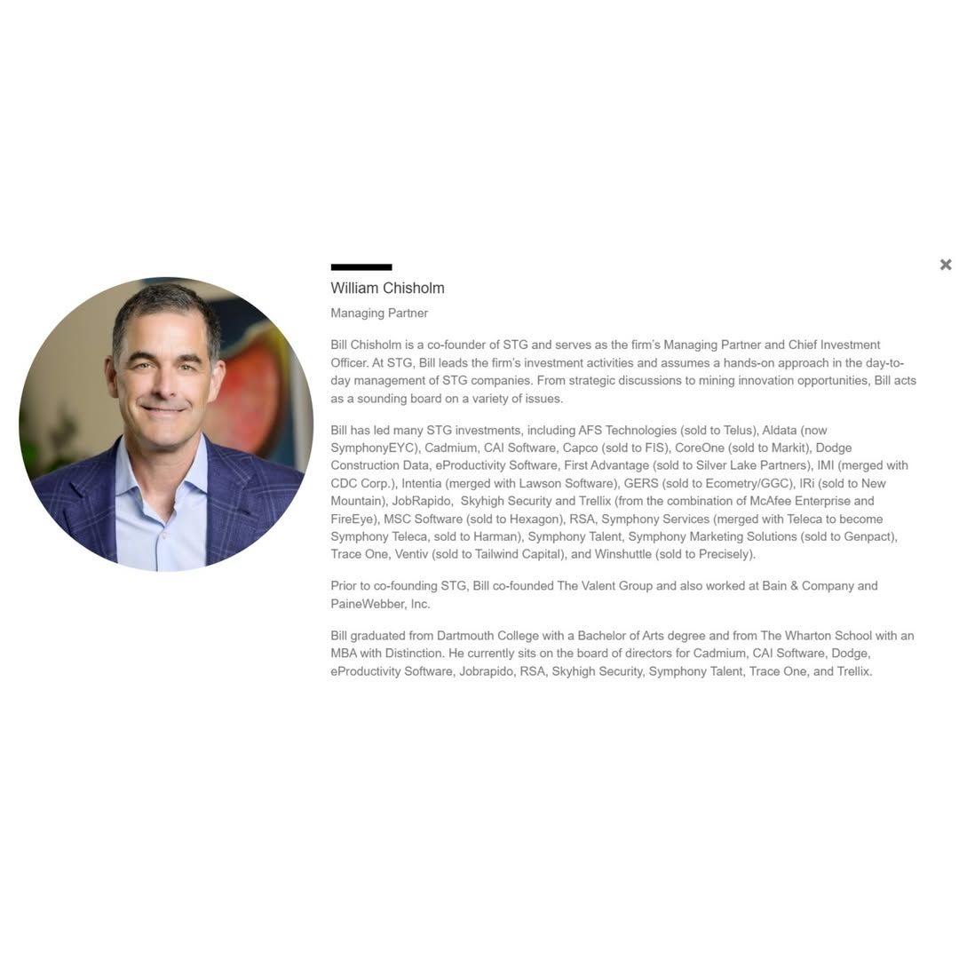 William Chisholm, más conocido como Bill Chisholm, es fundador y socio director de Symphony Technology Group (STG), empresa especializada en inversiones dentro de la industria de la Tecnología. Según Sporting News, McAfee Enterprise, Avid, Dynatrace y RSA Security son algunas de las empresas que han adquirido desde su creación en 2002.