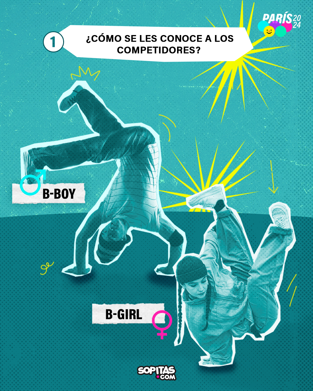 En el breakdance los competidores son conocidos como B-Boys, en el caso de los hombres, y B-Girls en el caso de las mujeres. La B se desprende de los conceptos de Breakdance o Breaking, como también se le conoce a esta disciplina.