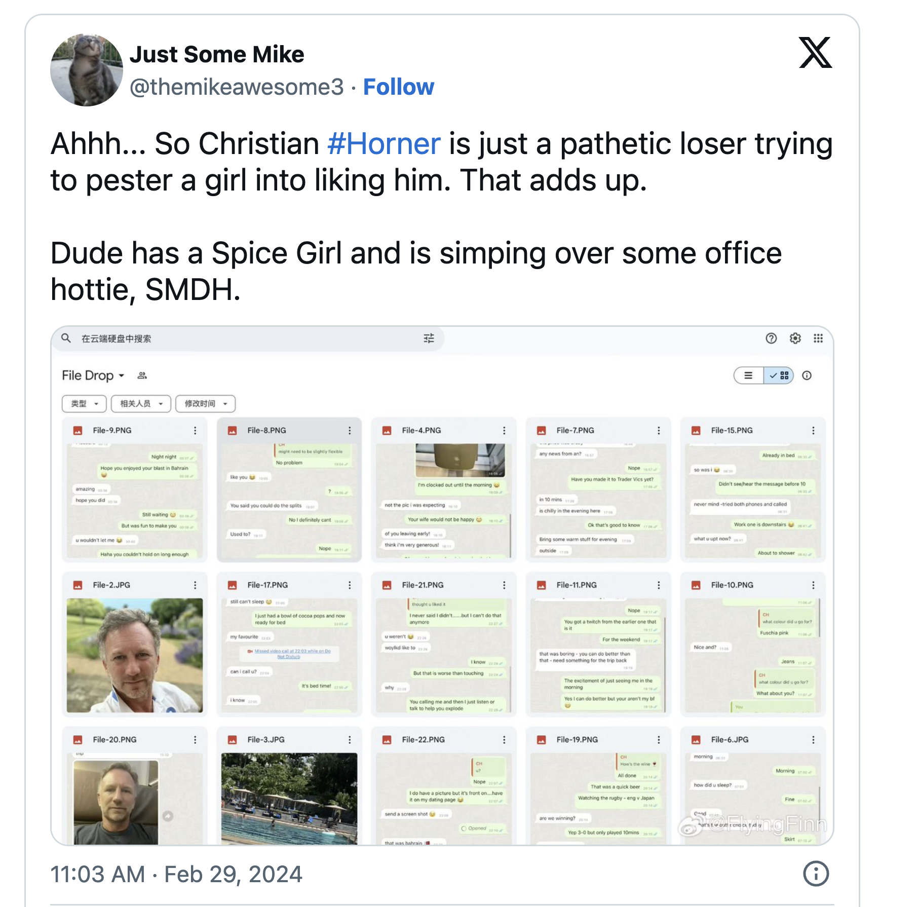 Al día siguiente de que Christian Horner fuera absuelto, se filtraron diferentes mensajes y fotografías de una supuesta conversación entre él y una empleada no identificada de Red Bull, donde Horner buscaba una relación e interacción sexual entre ambos.