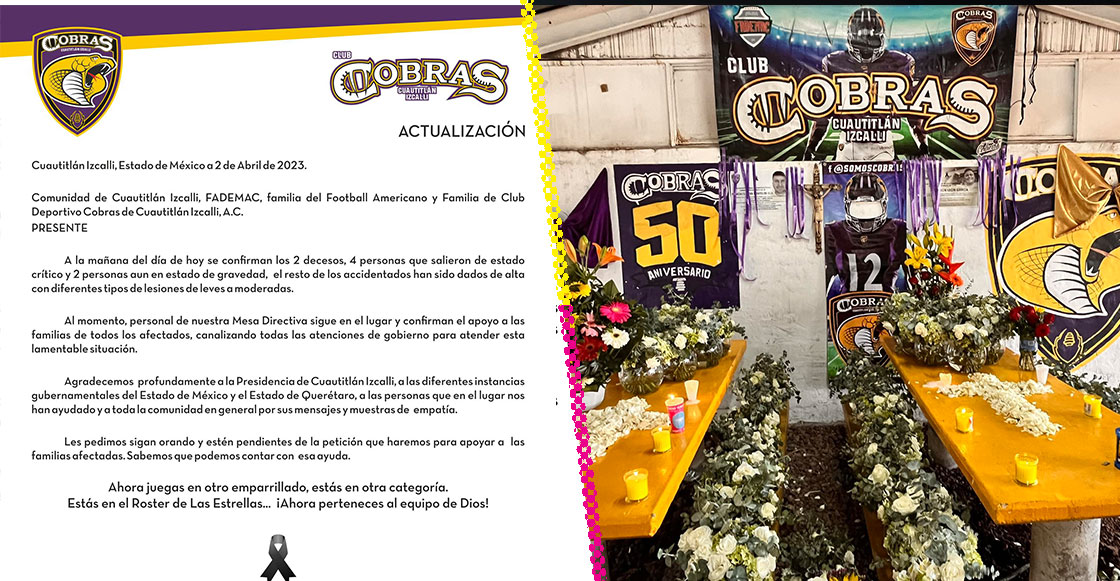El equipo de Cobras de Cuautitlán Izcalli se vio involucrado en un grave accidente automovilístico en la carretera México-Querétaro, en el cual fallecieron dos personas y dos más se encuentran en estado crítico, de acuerdo con información de la revista Proceso, después de que el equipo femenil regresaba de su competencia en La Liga de Futbol Americano del Estado de México (Fedemac).