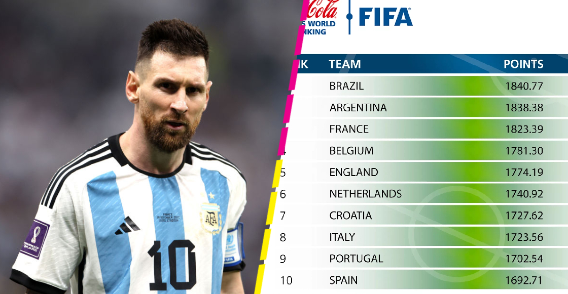 Los subcampeones de Qatar 2022, Francia, se mantienen en el tercer lugar, pero ahora arriba de Bélgica. Inglaterra completa el Top 5, mientras que Croacia logró meterse hasta el séptimo peldaño tras su buena actuación en el Mundial.